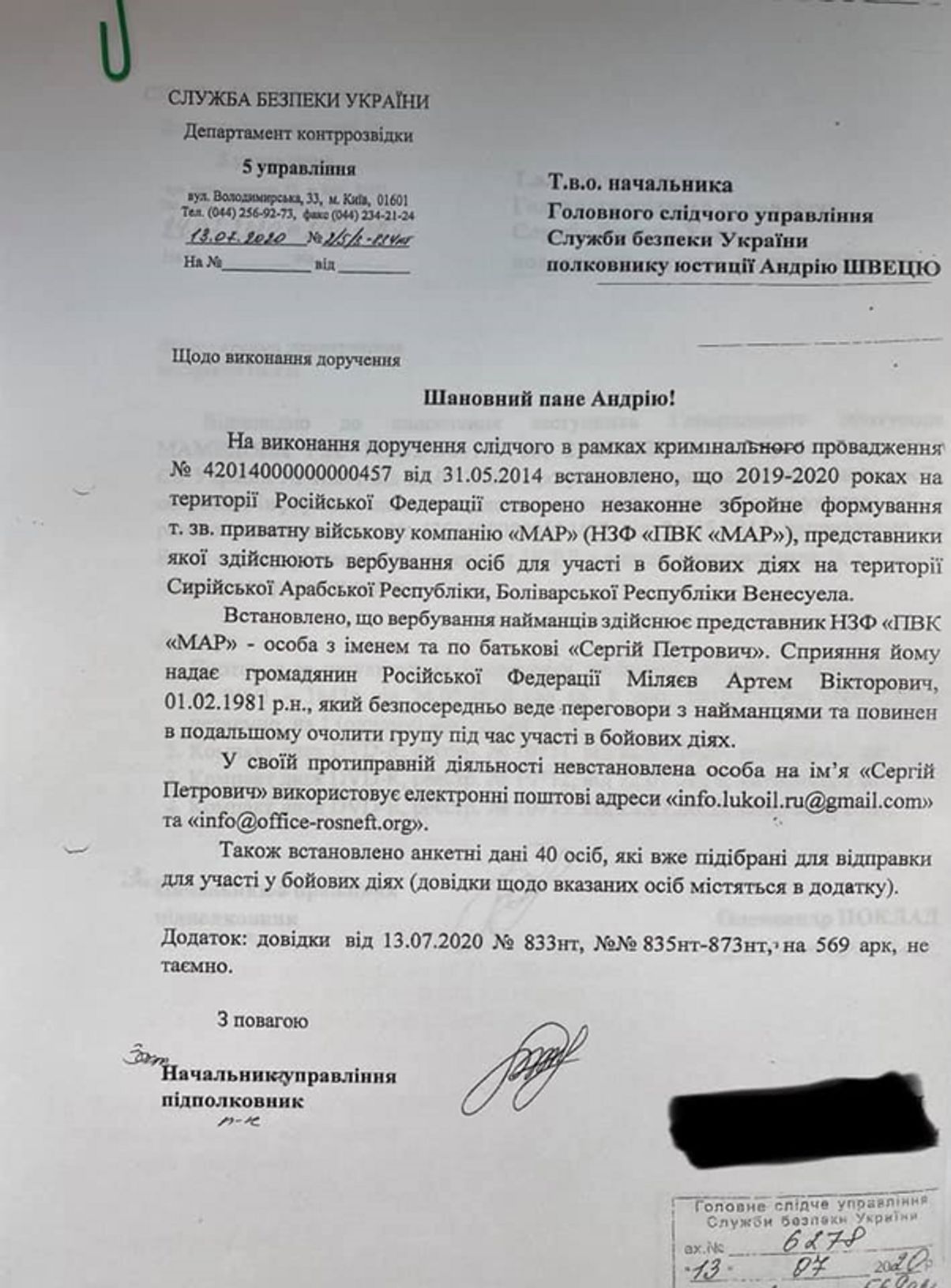 Хотя СБУ активно помогала операции, формально нужно было выставить все так, что СБУ о боевиках узнает случайно (ведь по легенде самолет сажают из-за звонка бдительного гражданина). Для этого придумали еще одну легенду: анонимный информатор сообщал СБУ о продолжающейся незаконной операции по вербовке наемников и называл адрес и пароль к электронной почте — info @rosneft-office. org. Как только СБУ отреагирует на такую наводку, они смогут загрузить все тысячи страниц компрометирующих документов, включая резюме, фотографии и видео. СБУ также сможет отслеживать подготовку к отъезду наемников из России с помощью билетов и планов полетов. И главное — они смогут немедленно отреагировать, как только обнаружат, что — случайно, после предупреждения о взрыве — самолет, на котором находились эти заинтересованные лица, приземлился в аэропорту Борисполь под Киевом.