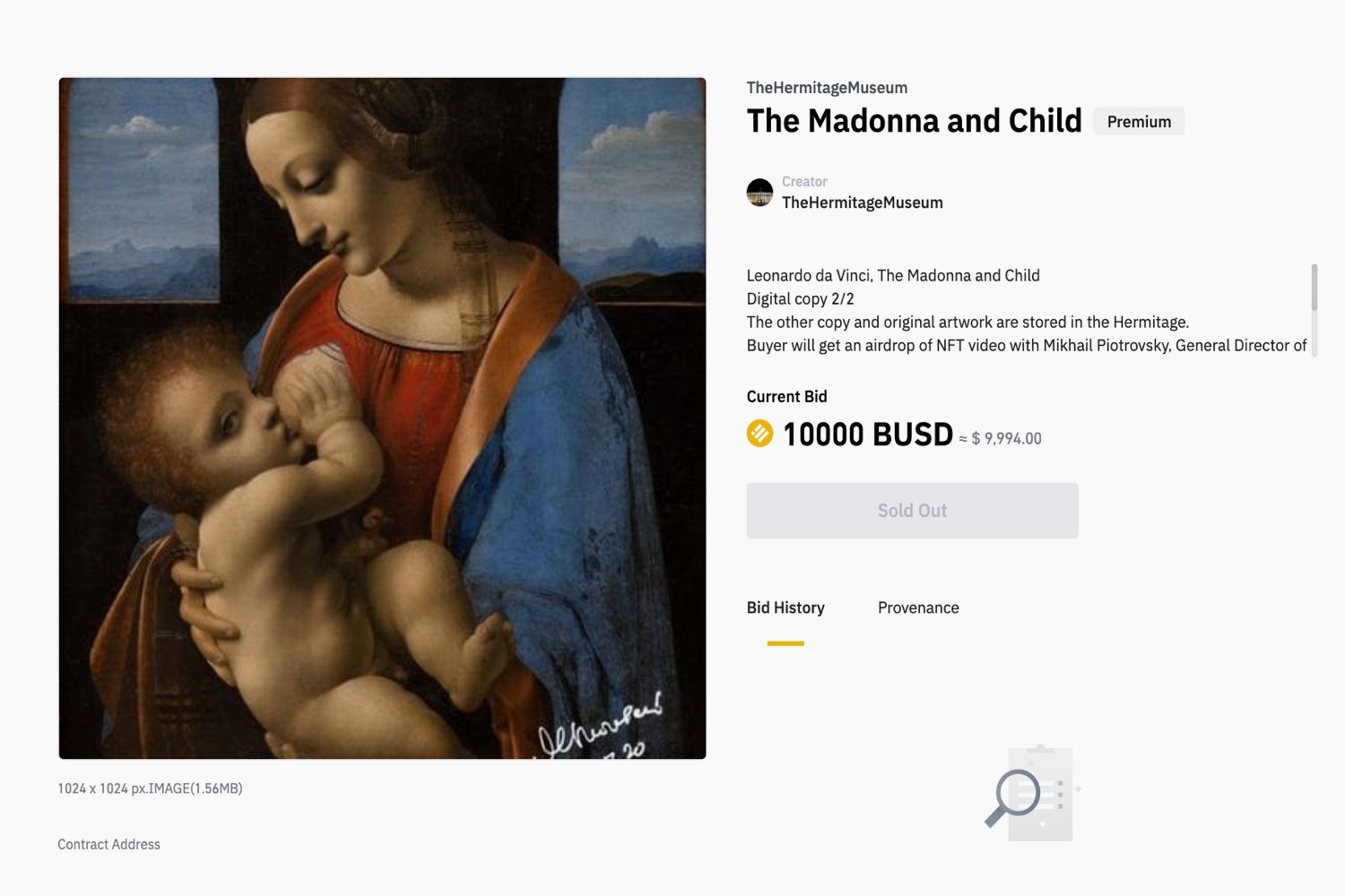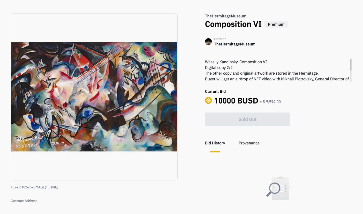 St. Petersburg’s State Hermitage Museum held an NFT auction from August 31 to September 7, with the help of the world’s largest cryptocurrency exchange company — Binance. Digital reproductions of five paintings were put up for auction: Leonardo da Vinci’s “Madonna Litta,” Giorgione’s “Judith,” Vincent van Gogh’s “Lilac Bush,” Wassily Kandinsky’s “Composition VI,” and Claude Monet’s “Corner of the Garden at Montgeron.”