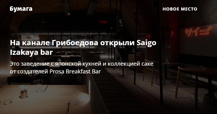 На набережной канала Грибоедова, 5 — по соседству с Prosa Breakfast Bar — открыли Saigo Izakaya bar. Это заведение японской кухни, переосмысляющее формат изакая-бара — японских баров с недорогими закусками и напитками. Проектом занимаются создатели Prosa Андрей и Ксения Корельских.