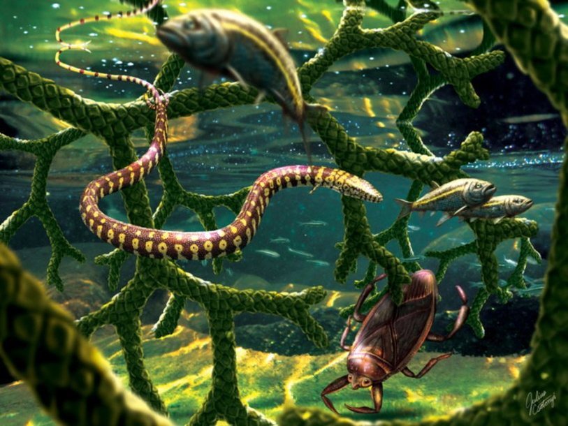 Julius Csotonyi Авторы нового исследования пришли к выводу, что Tetrapodophis amplectus — уникальное животное, жившее 110 миллионов лет назад на территории современной Бразилии, которое ранее было описано как первая известная змея с передними и задними конечностями, — все-таки относится не к змеям, а к ящерицам из ныне вымершего семейства водных ящериц Dolichosauridae.