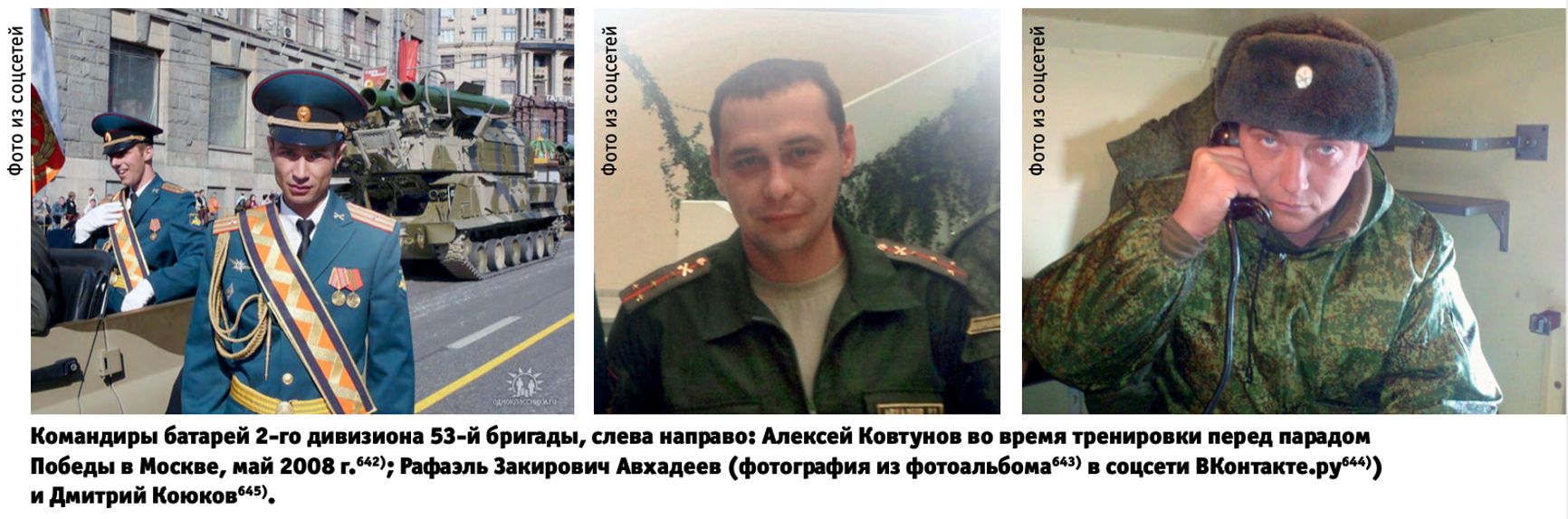 Как мы знаем, во 2-м дивизионе 53-й бригады насчитывается три батареи, которыми летом 2014 г. командовали, согласно заключению Bellingcat, майор Алексей Ковтунов (см стр 86.доклада Bellingcat), капитан Рафаэль Закирович Авхадеев (стр. 86-91 доклада) и Дмитрий Коюков. Заметим, что при переходе на каждый последующий, более низкий уровень организационной структуры 53-й бригады по иерархической цепочке «бригада → дивизион → батарея → отделение/расчет» достоверность выводов Bellingcat по личностям командиров подразделений снижается из-за нехватки информации, достаточной для надежной (многократно-перекрестной или официальной) идентификации офицеров. Тем не менее уже имеющейся по каждому офицеру информации хватает для обоснованных выводов.