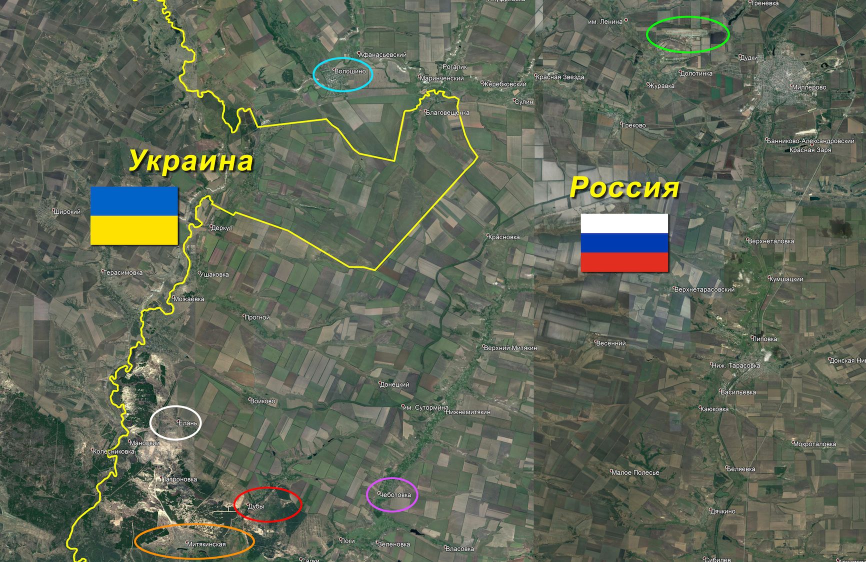 Места съемок фотографий в полевых условиях военнослужащих 2-го дивизиона 53-й зенитно-ракетной бригады летом 2014 года на карте местности (интернет-сервиса Google Earth) к западу и юго-западу от Миллерово (аэродром обведен зеленым) Ростовской области. Окрестности деревни Дубы обведены красным, Митякинская — оранжевым, Чеботовка — фиолетовым, Волошино — синим и Елань — белым цветом