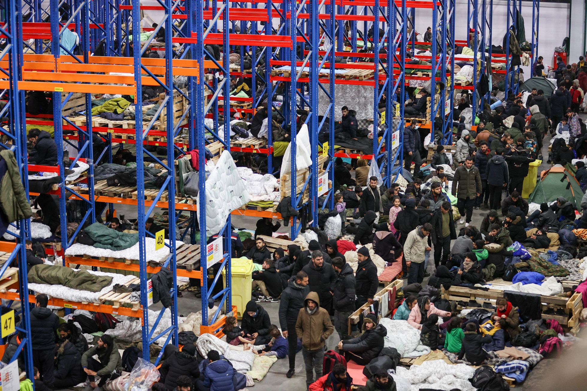 Мигрантов разместили в логистическом центре на границе Беларуси. Они спят на стеллажах для товаров. Фотография