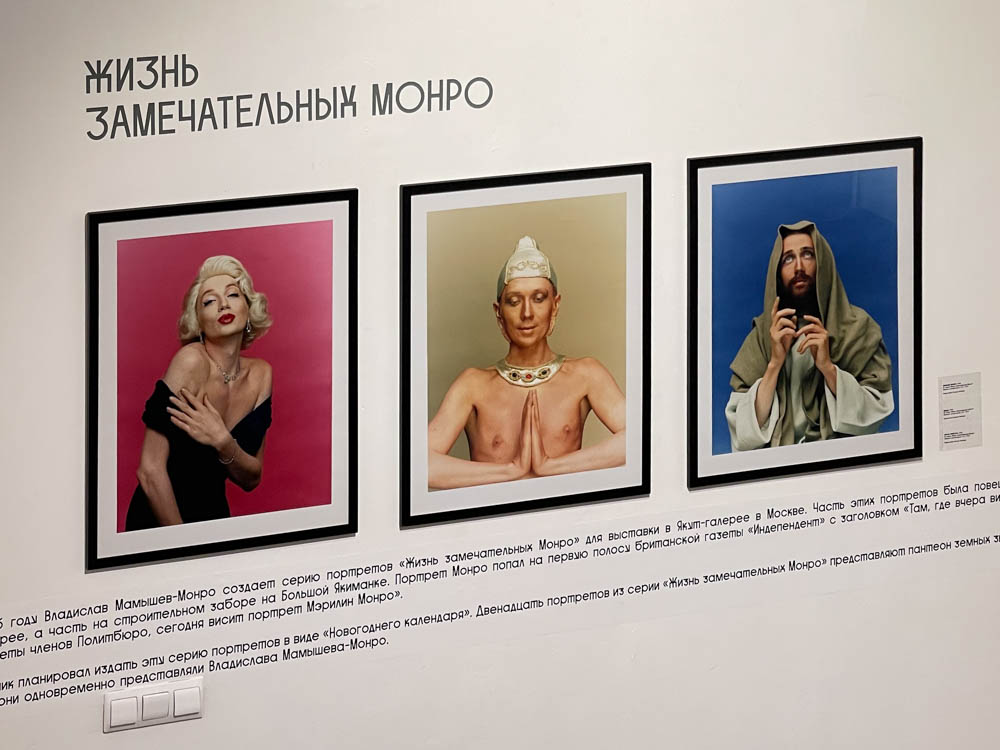 В галерее на набережной Фонтанки, 24 выставили произведения Владислава Мамышева-Монро из собраний Русского музея, «Нового музея» Аслана Чехова и других коллекций. Куратор проекта Олеся Туркина собрала как отдельные работы, так и целые серии: например, цикл фотографий «Сказки о потерянном времени», посвященный судьбам людей искусства в начале XX века, или «Жизнь замечательных Монро», в которой автор перевоплощался в знаменитых людей: от Шерлока Холмса до Екатерины II.
