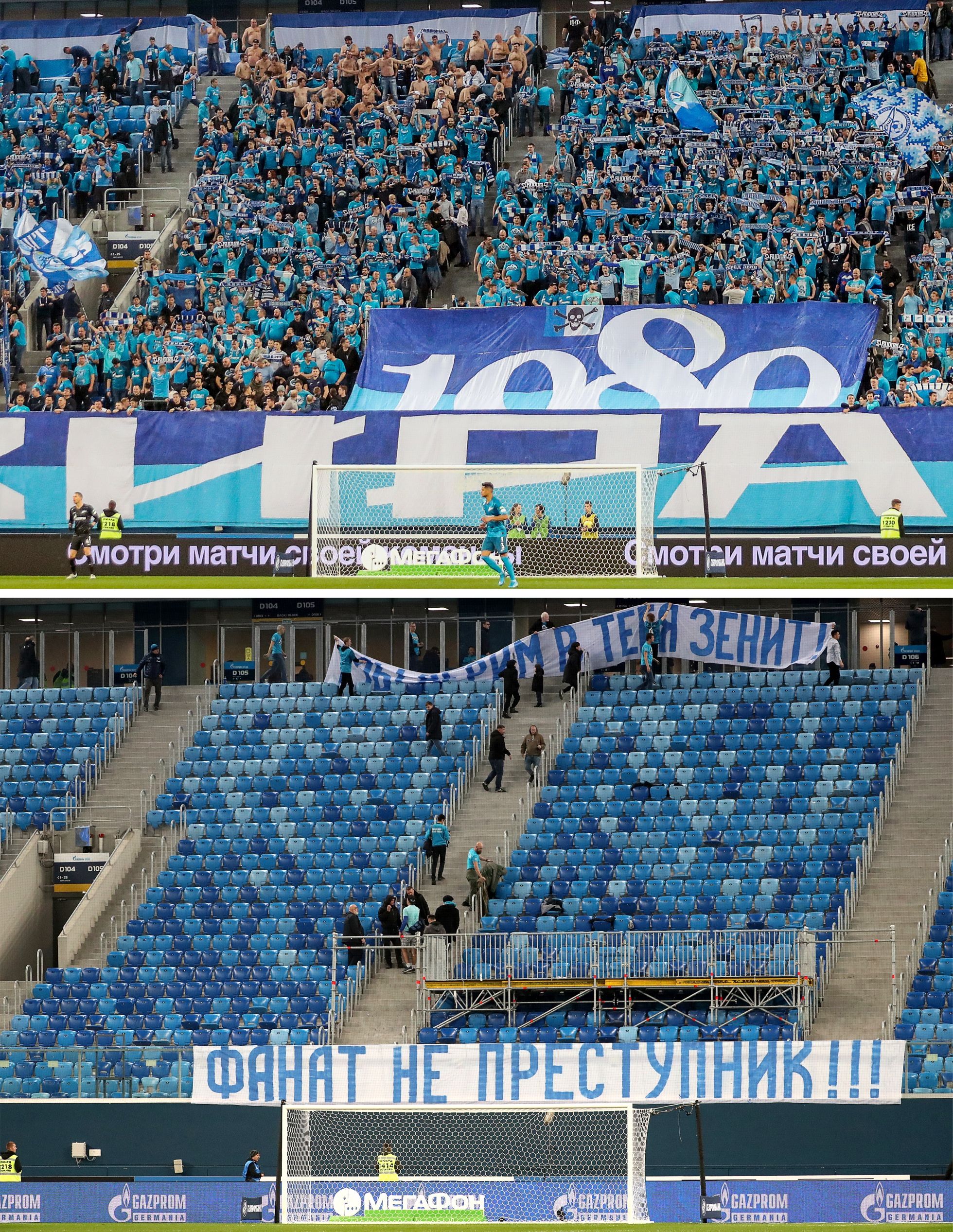 Александр Демьянчук / ТАСС Комбинированная фотография трибун, с которых в знак протеста ушли болельщики «Зенита». Перед матчем между «Зенитом» и «Спартаком» в Москве за мелкое хулиганство были задержаны около 90 футбольных фанатов, большинство из них поддерживали «Спартак». Россия, Санкт-Петербург, 2019