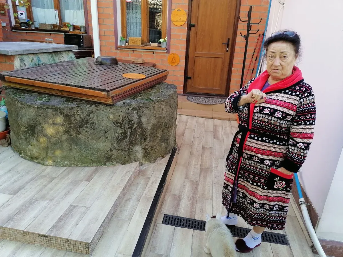 Она ведет меня вглубь своего участка, мимо ветхих пустых «комнат для отдыхающих» к хорошему двухэтажному дому. До нее эта земля принадлежала ее матери, Ольга Васильевна здесь родилась, выросла, родила и вырастила детей. В глубине двора — широкий колодец из старого, зеленоватого от времени известняка.