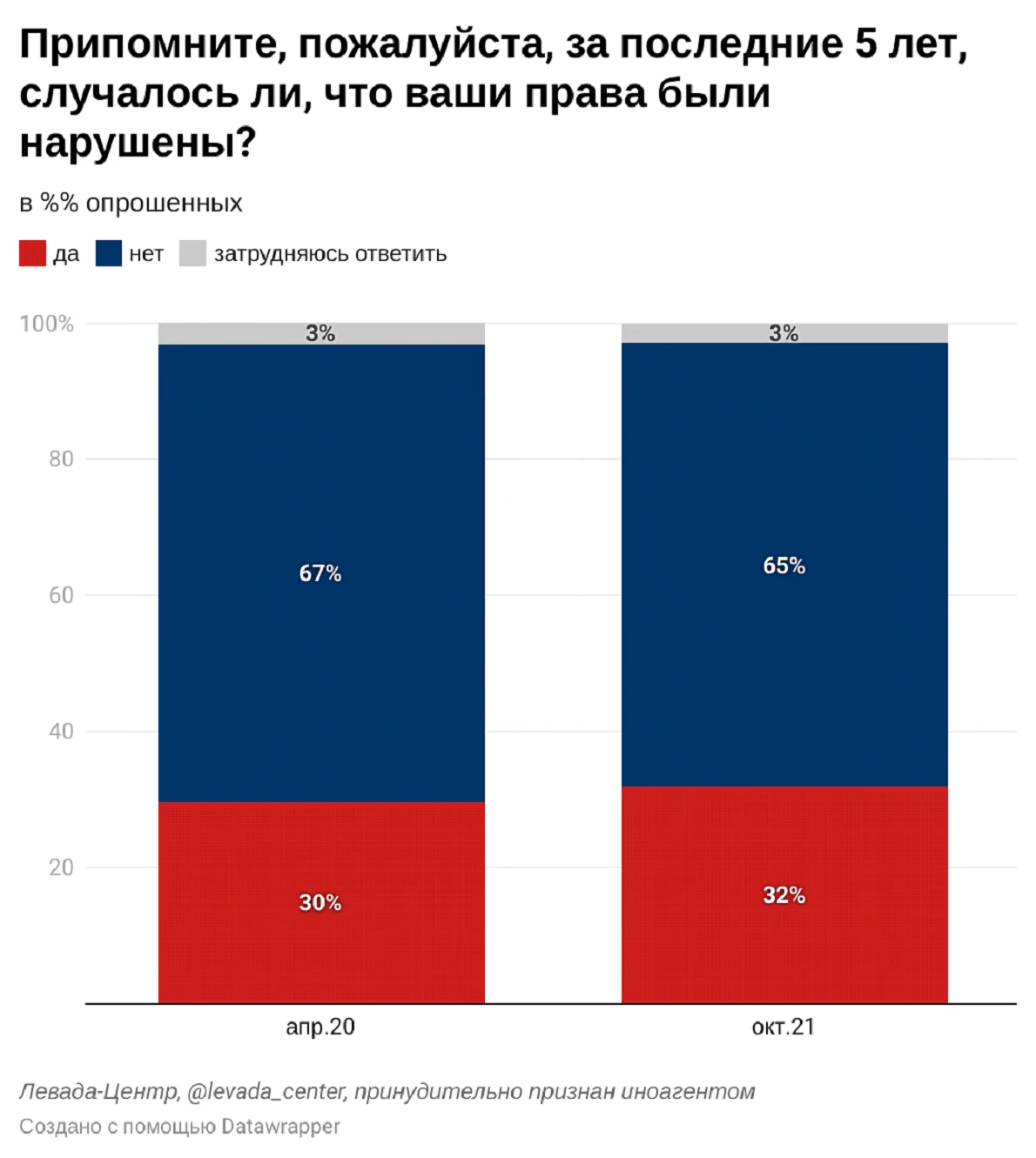 Треть россиян (32%) за последние пять лет сталкивались с нарушением своих прав, две трети (65%) — не сталкивались, следует из опроса «Левада-центра»* (имеется в распоряжении «Новой газеты»).