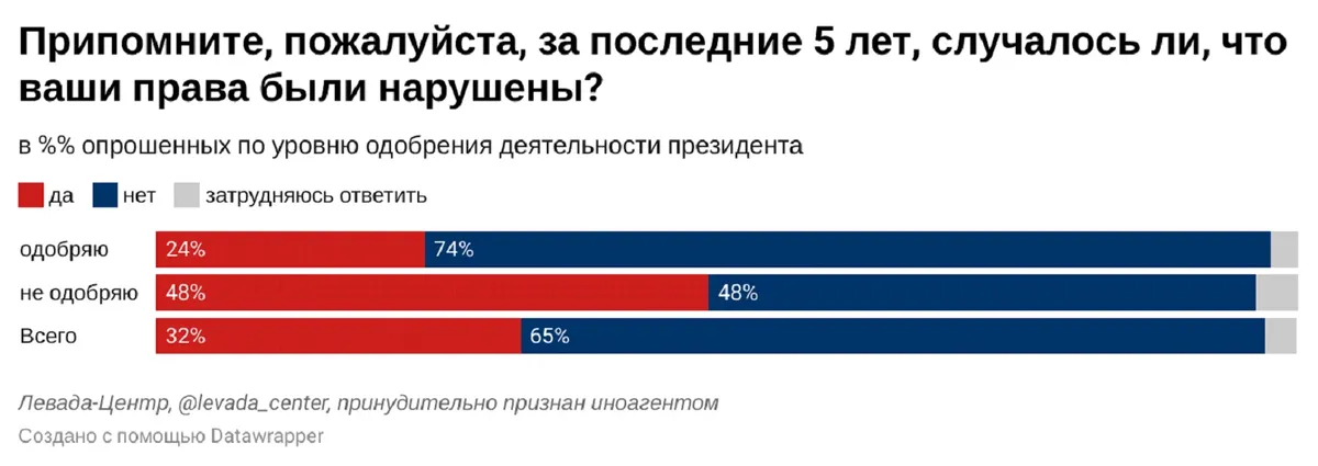 Как отмечает социолог, люди, выражающие неодобрение деятельности президента, в два раза чаще заявляют, что сталкиваются с нарушением их прав, чем одобряющие. «Это объяснимо: