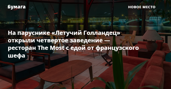 Гастрономический кластер на корабле «Летучий Голландец» полностью укомплектован — там открыли ресторан The Most, сообщили «Бумаге» представители проекта. Это уже четвертое заведение на борту парусника, пришвартованного на Мытнинской набережной.