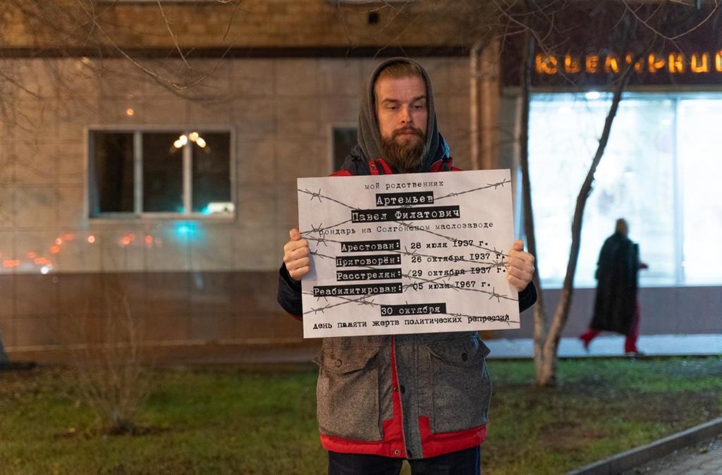 – В позапрошлом году я тоже выходил в такой пикет, а сын выходил в прошлом году. Это и дань памяти, и протест против замалчивания репрессий. В нынешнем году Герасим в пикете в день памяти не участвовал – обложили за другие дела. Он экозащитник, борец за свободу. За участие в митингах много раз попадал в кутузку, ему выписывали огромные штрафа – 100 и даже 200 тысяч рублей. Сын говорит, что уже на улицу не может выйти без того, чтобы не попасть под санкции, – объясняет Дмитрий.