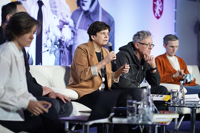 Ирина Прохорова — соучредитель Фонда Прохорова, модератор дискуссии, олицетворяет силы добра и порядка.