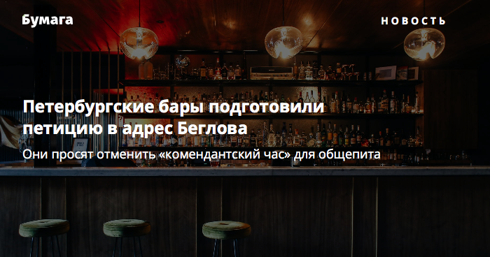 Владельцы петербургских баров подготовили новую петицию в адрес губернатора города Александра Беглова. Они просят отменить «комендантский час» для заведений общепита.