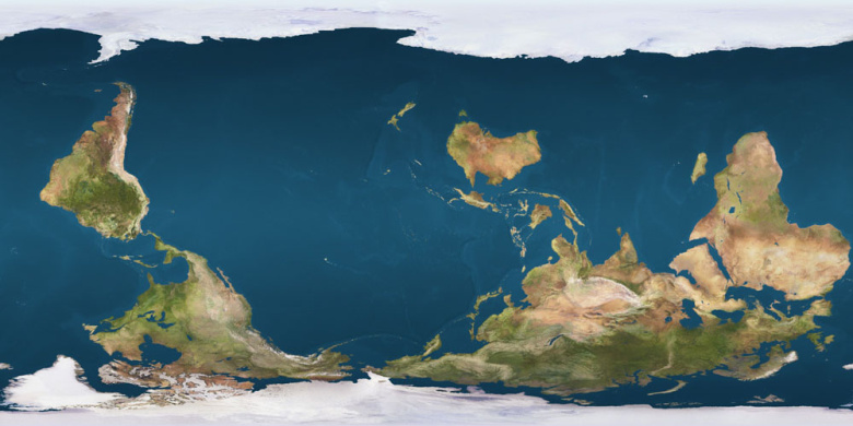 Взгляд из Австралии: карта мира, на которой доминирующим («верхним») полушарием становится Южное, Тихий океан показан целиком, а Атлантический разделен (на традиционных картах все наоборот)