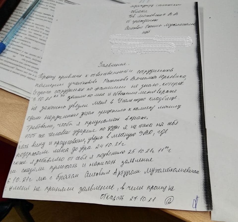 По словам Артура, дядя Аитовых настоял на том, чтобы Оксана поехала с ним в Тюмень (расстояние больше ста километров) и заявила о побоях и истязании полицейскими в СК области. Там заявление наконец приняли и дали направление на медэкспертизу спустя почти две недели после побоев.