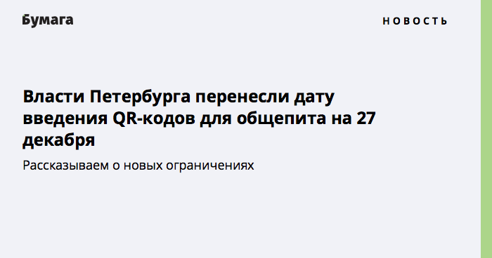 Власти Петербурга перенесли дату введения QR-кодов для общепита на 27 декабря