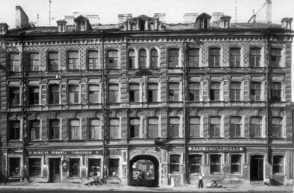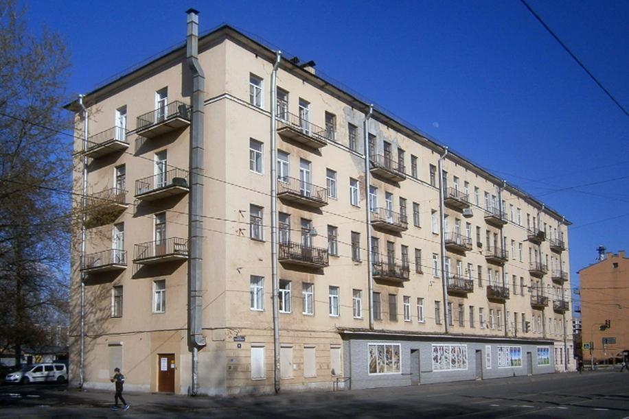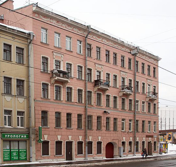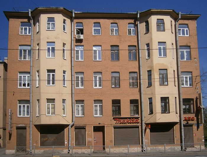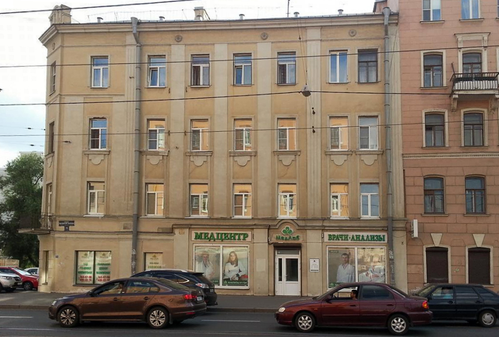 Жилой дом. Построен в 1917 году. По данным Citywalls, дом составлен из трех исторических лицевых корпусов, надстроенных и объединенных в послевоенное время единым фасадом. С середины XX века здесь размещался отдел милиции (полиции), сейчас — центр общественных связей ГУ МВД по Петербургу. Местные жители жалуются на грязные и давно не ремонтировавшиеся подъезды.