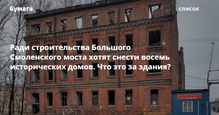 Нынешний проект Большого Смоленского моста в Невском районе предполагает снос восьми исторических зданий на проспекте Обуховской Обороны. Они построены в период с 1851 по 1917 год и защищены законом об объединенных охранных зонах. Чтобы сделать снос возможным, на совете по сохранению культурного наследия предложили изменить закон. При этом в КРТИ «Бумаге» сообщили, что «проектные решения» еще находятся на стадии проработки.