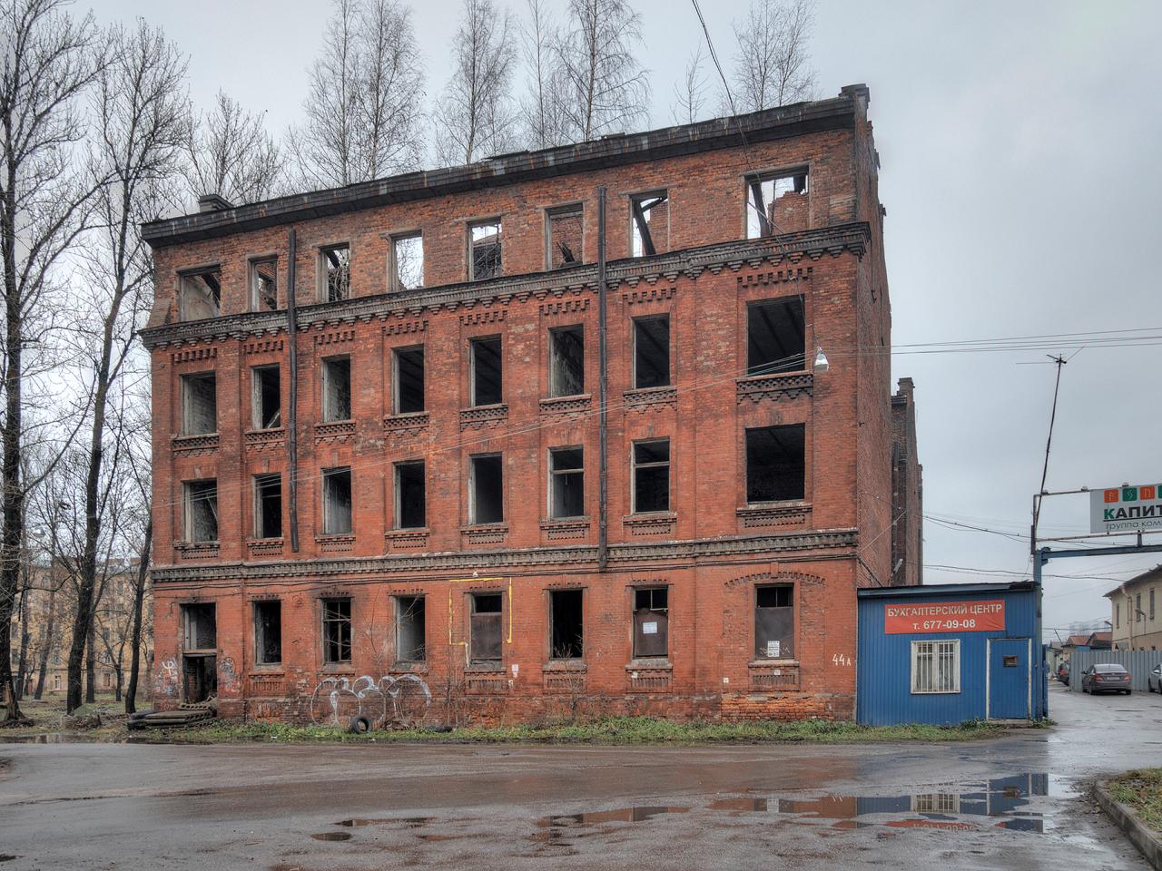 Заброшенное здание. Построено в период с 1900 по 1910 год. Предположительно, оно предназначалось как жилье для рабочих некоего предприятия неподалеку. В советское время здесь надстроили дополнительный этаж. В 2013-м предполагалось, что здание реконструируют под нужды полиции, оно даже было передано на оперативное управление УМВД по Невскому району, однако никаких работ там до сих пор не ведется.