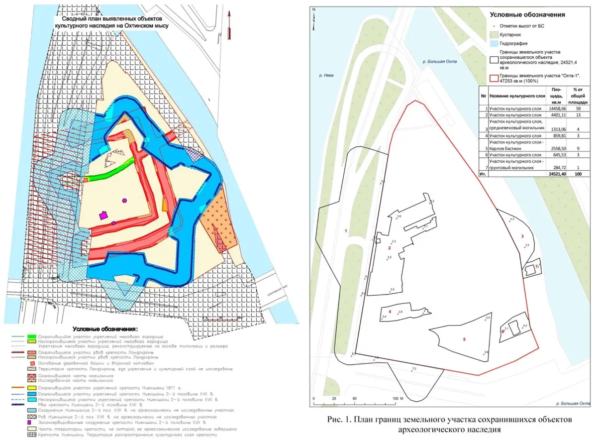 Распоряжением Минкульта в границы охтинского памятника включено лишь 15% ценной для наследия территории мыса. Выпущен этот документ был на основании выводов скандальной экспертизы казанского археолога Айрата Ситдикова 2018 года. На приложенной им графической документации рвы Ландскроны вообще не указаны — зияющая пустота у него на этом месте. Хотя он и приводит выдержки из отчетов экспедиций прошлых лет, фиксирующие оборонительные рвы Ландскроны и основание башни, и не опровергает эти сведения. Более того, выводы проведенных самим Ситдиковым раскопок подтверждают наличие «стенок рвов, законсервированных полиэтиленовым покрытием». Но в границы охтинского памятника он их не включает. Как и территорию башни-донжона, хотя включает в предмет охраны периметр деревянного сруба — только без его содержимого и в отрыве от основания самой башни. То есть превращая недвижимый объект в движимый.