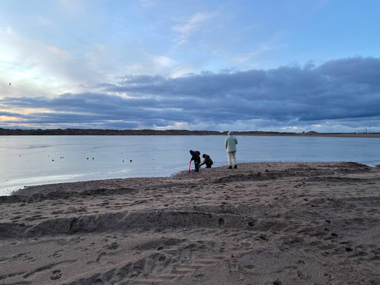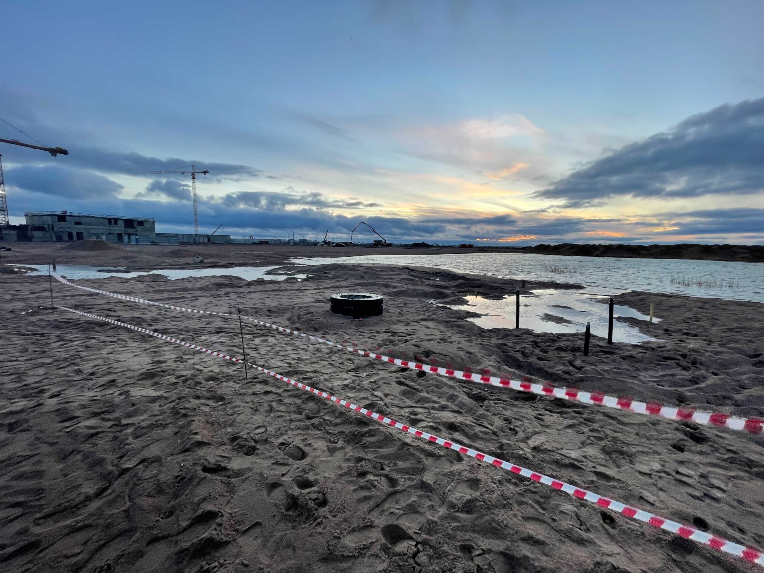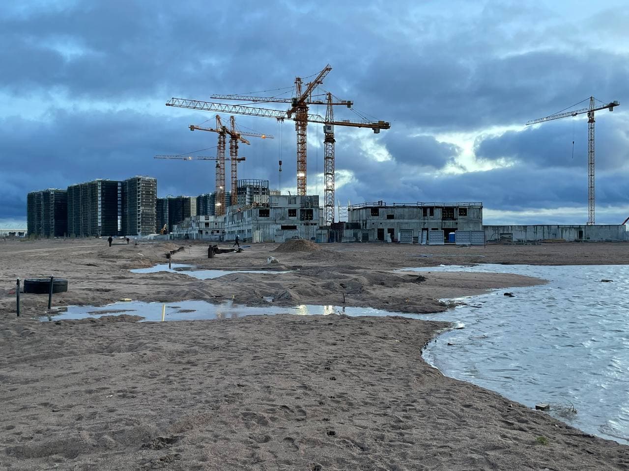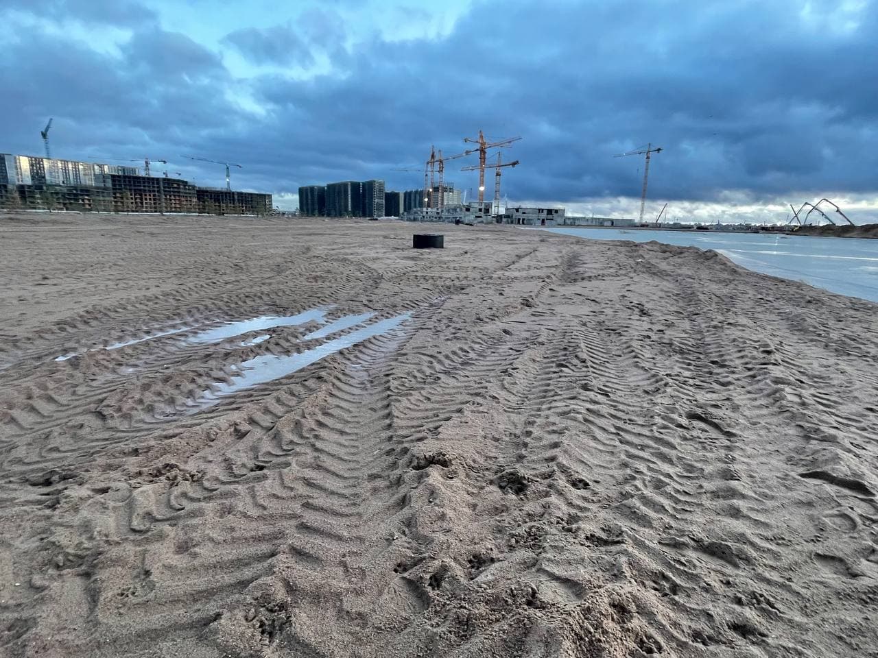 Вечером 26 ноября журналистка «Бумаги» побывала на намыве — и тоже провалилась в песок. Корреспондентка почувствовала, как ее ногу начало засасывать. Образовавшаяся лунка быстро наполнилась водой.