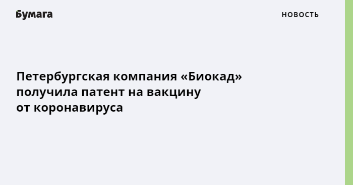 Петербургская биотехнологическая компания «Биокад» получила патент на вакцину от COVID-19. Об этом сообщает «РИА Новости» со ссылкой на Роспатент.