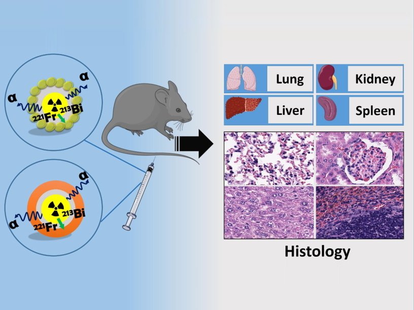 Чтобы проверить, действительно ли наночастицы способны удержать радионуклид, биологи ввели образцы в виде суспензии в хвостовую вену мышей. На первый, третий и десятый день после терапии животных безболезненно умерщвляли, а их органы исследовали на радиоактивность, которая была признаком распада 225Ac. В качестве группы контроля исследователи использовали мышей, которым вводили чистый 225Ac без наночастиц-носителей или с наночастицами, но без покрытия из золота или титана.