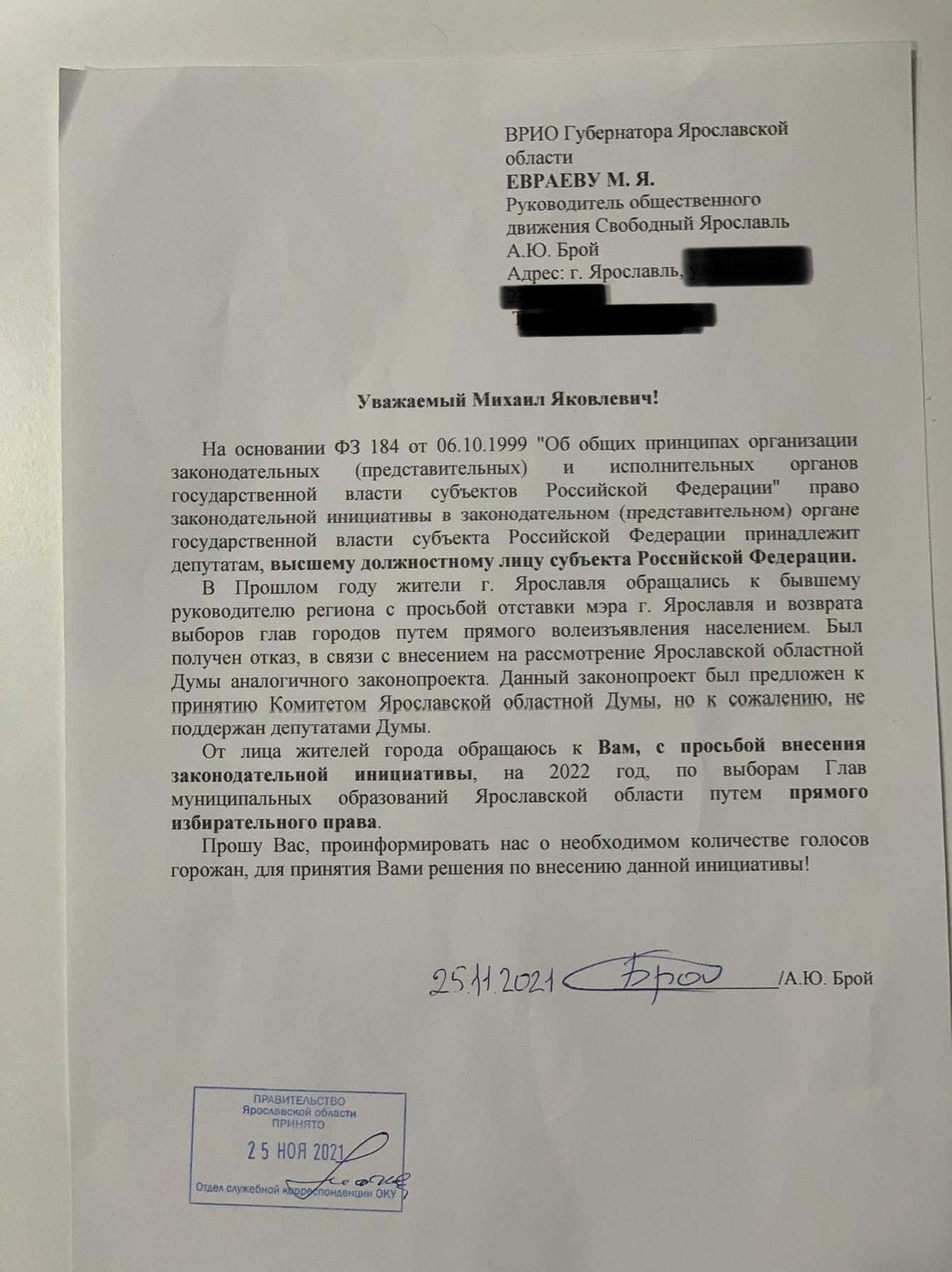 Обратился к ВРИО губернатора ЯО Михаилу Яковлевичу Евраеву с просьбой вернуть горожанам право самим выбрать градоначальника.