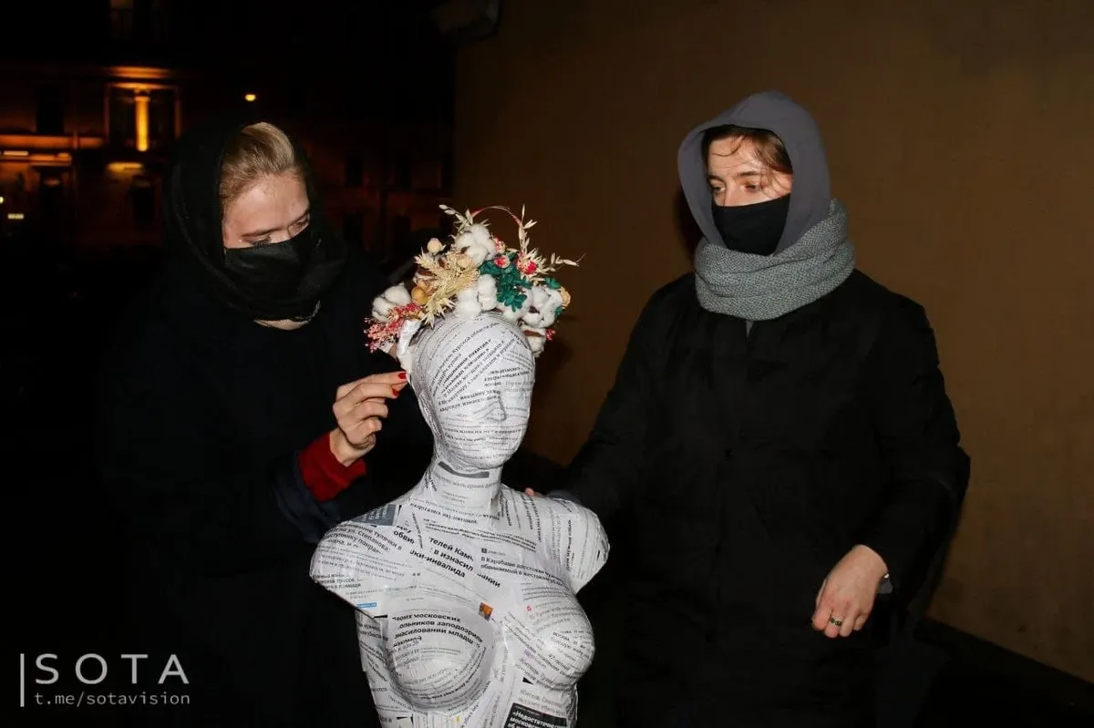 Акция против домашнего насилия прошла на набережной реки Мойки. Активистки прикрепили на женский манекен распечатанные вырезки из новостей о насилии, надели на его голову венок и возложили цветы. По словам девушек, она была посвящена международному дню борьбы за ликвидацию насилия в отношении женщин.