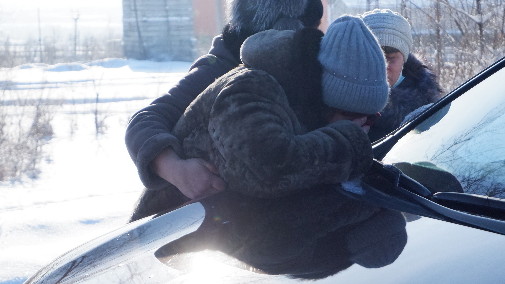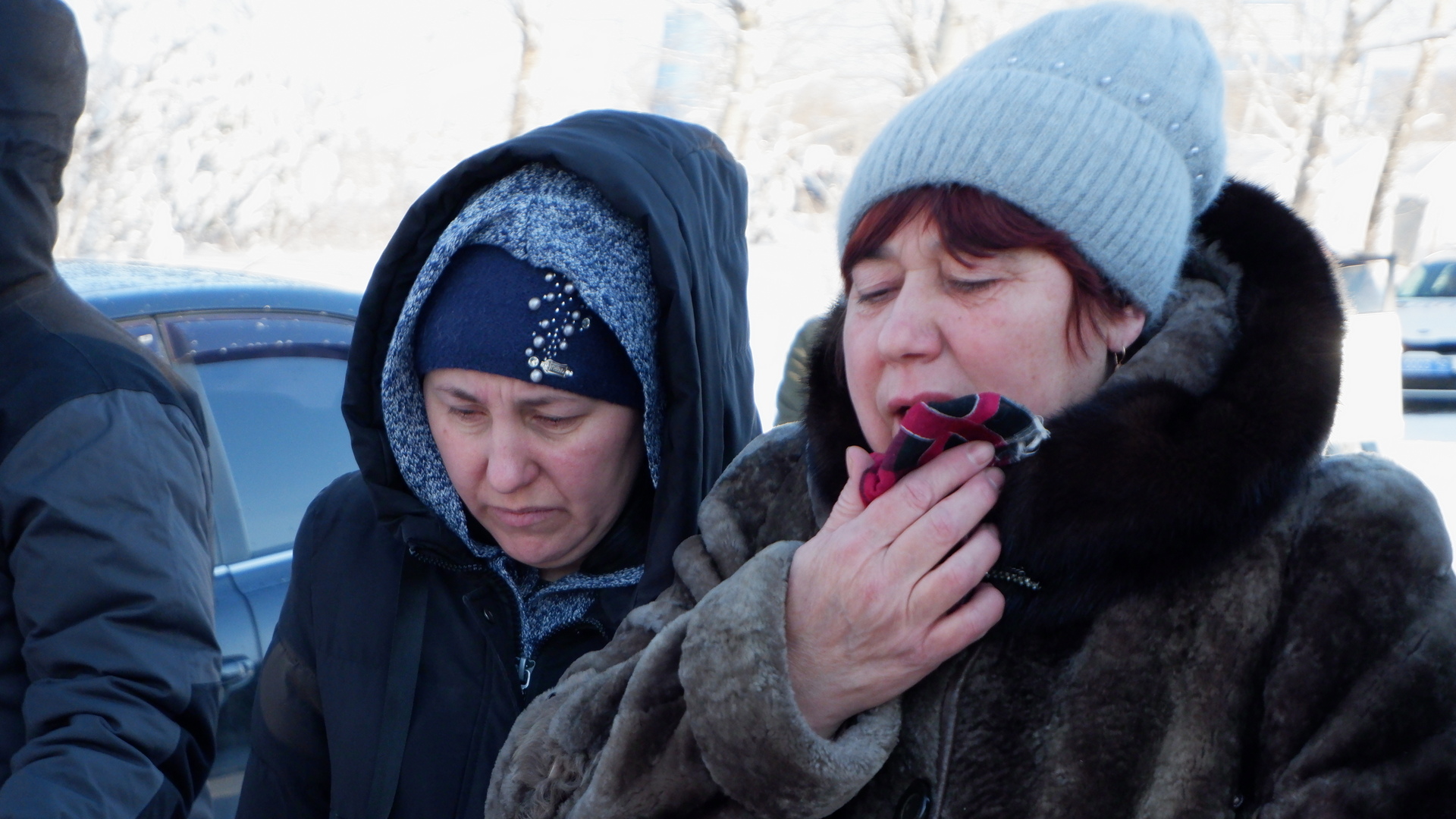 Спустя время через КПП проходят и направляются к своему автомобилю еще две женщины. Одна поддерживает другую. Из разговора становится понятно, что это – мать и теща погибшего. Они двигаются, окруженные кольцом журналистов.