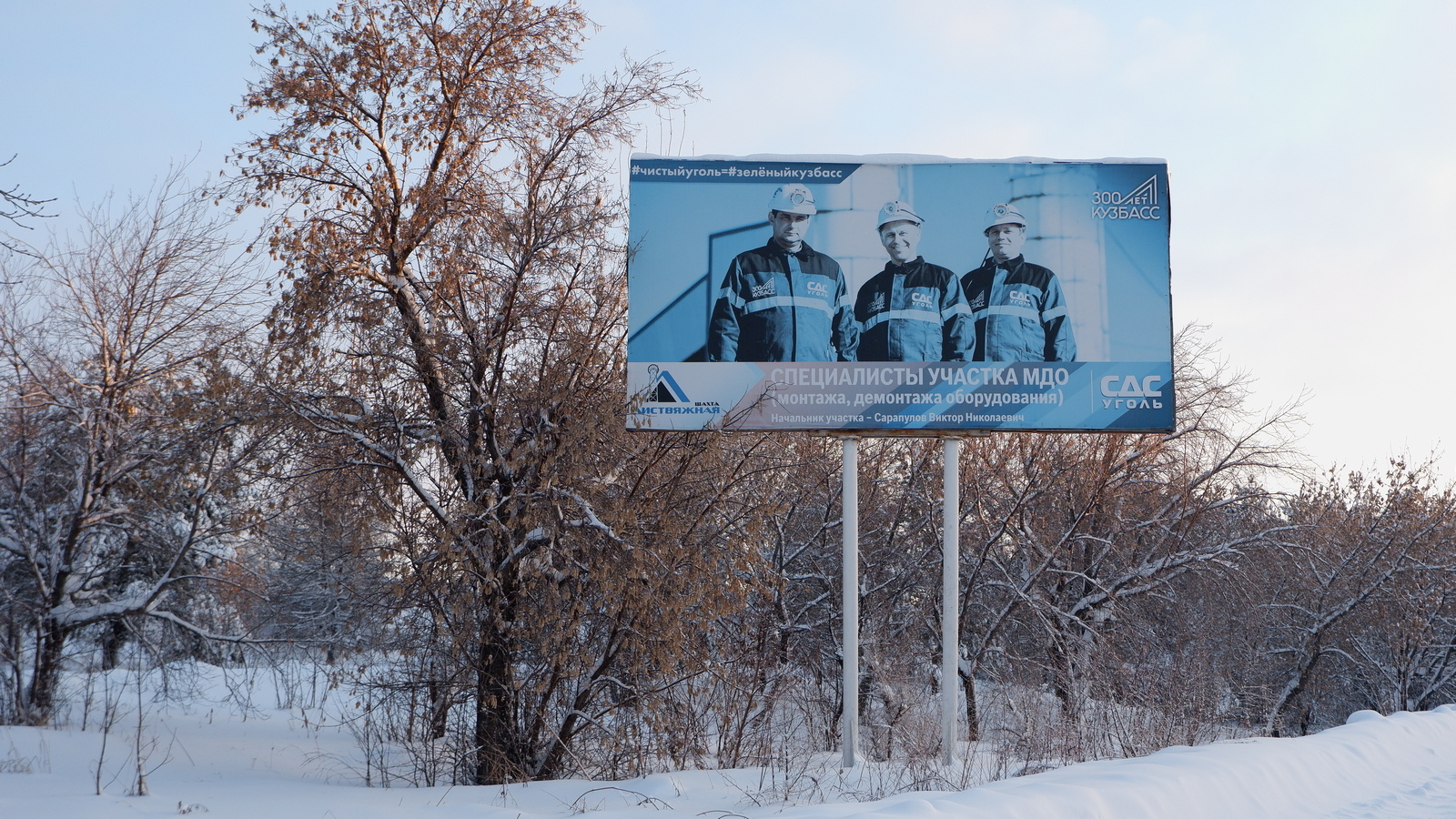 О том, что рядом шахта, напоминают только баннеры с передовиками производства в касках и неизменным слоганом: "Чистый уголь – зелёный Кузбасс", а еще корпуса углеобогатительной фабрики, расположенной рядом с шахтой. Повсюду полицейские машины с включёнными проблесковыми маячками.