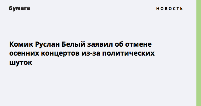 Стендап-комик Руслан Белый сообщил, что этой осенью несколько его запланированных концертов (в том числе в Петербурге) были отменены из-за политических шуток. Такое заявление он сделал в эфире подкаста «Бухарог Лайв».