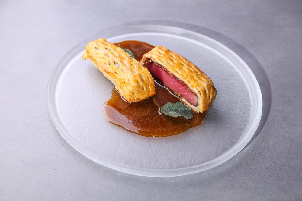 Вариация говядины «Веллингтон» — английского блюда, представляющего собой мясо в слоеном тесте