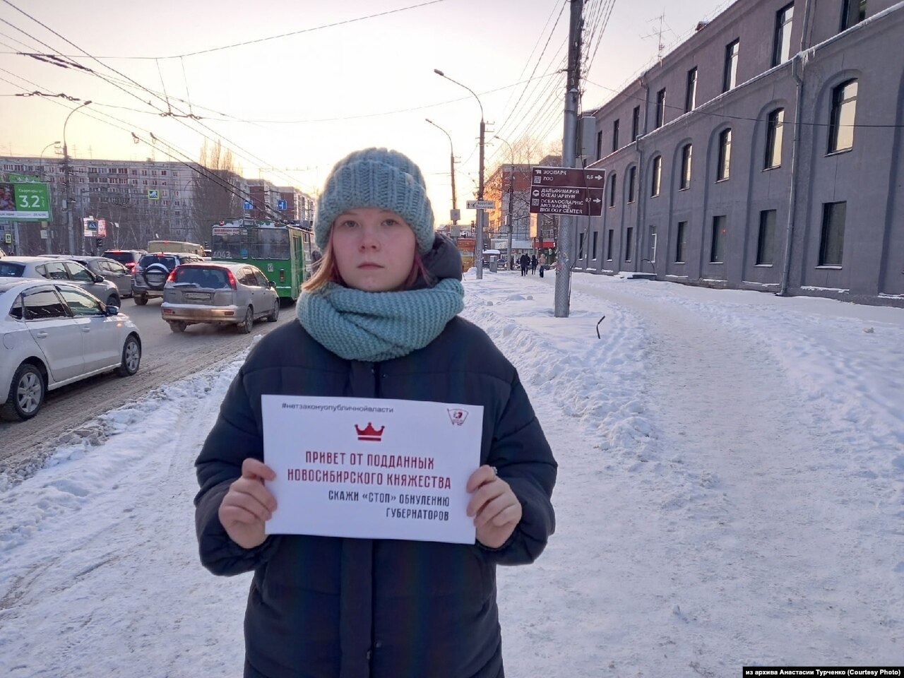 Одна из участниц акции Анастасия Турченко вышла на одночный пикет с плакатом "Привет от подданых новосибирского княжества. Скажи "стоп" обнулению сроков губернаторов. Активистка считает, что новый закон нарушит институт демократии, избирательное право.