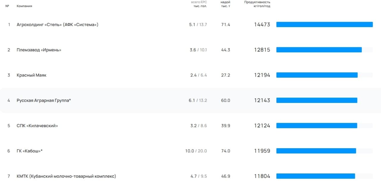 Лидером рейтинга с большим отрывом стал агрохолдинг «Степь» (Краснодарский и Ставропольский края), входящий в АФК «Система» Владимира Евтушенкова. На втором месте - племзавод «Ирмень» (Новосибирская область), на третьем - «Красный маяк» (Ярославская область).