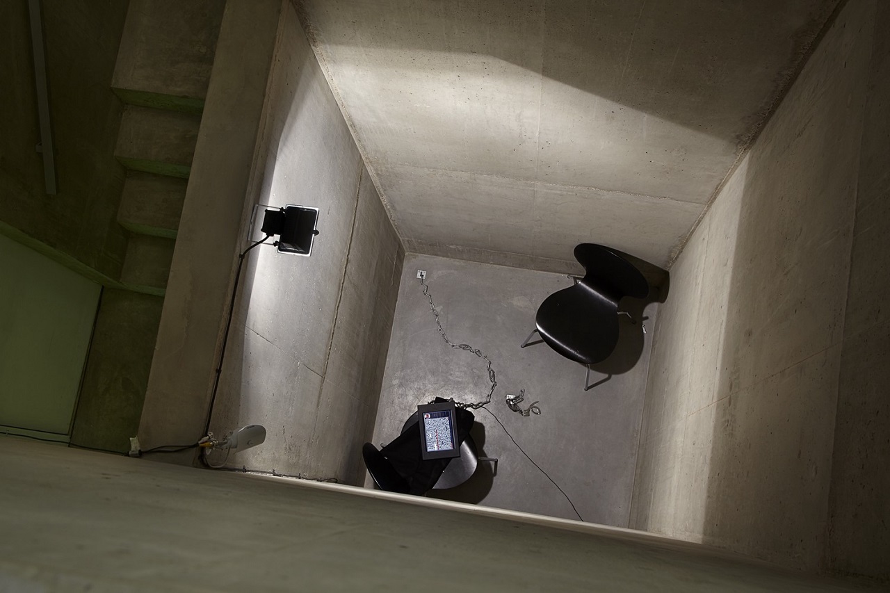 Гнетущая атмосфера помещений, перемещаться между которыми гостям выставки приходилось по некомфортным проходам. Бетонные стены. Тихое, но тревожное урчание компьютеров. То ли одиночная камера, то ли комната для допросов с наручниками и планшетом, демонстрирующим помехи. В то время как камера наблюдения в углу передает изображение на компьютеры в соседней комнате, оформленной как недра бункера, где спецслужбы кропотливо следят за каждым движением, которое им удается зафиксировать. На этих же компьютерах — текст «интервью».