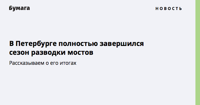 «Бумага» писала, что с середины ноября в Петербурге перестали разводить Сампсониевский, Гренадерский и Кантемировский мосты. Минувшей ночью в последний раз в этом году развели четыре моста — Литейный, Троицкий, Дворцовый и Благовещенский. В дальнейшем остальные переправы будут разводить только по заявке.