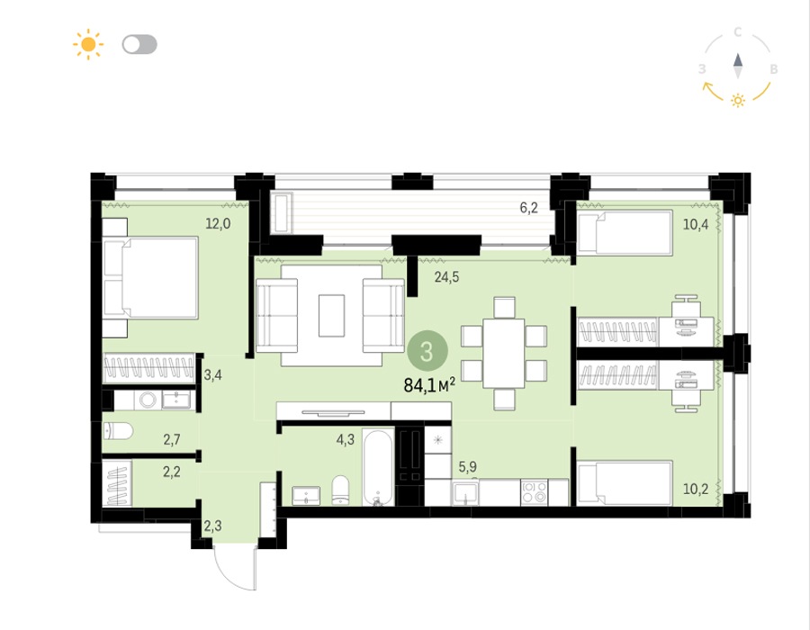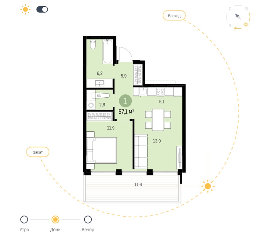 Это квартира в проекте «Авиатор» подходит для молодой семьи или пожилой пары, которая любит принимать гостей. Большие окна квартиры смотрят на две стороны света и открывают выход на прогулочную террасу с видом в сад.