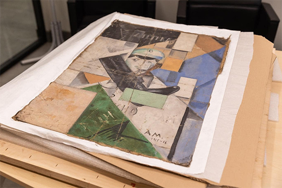 © Музей русского импрессионизма Картина «Композиция» Алексея Моргунова перед реставрацией. Москва, 14 ноября 2021 года 3 февраля 2022 года в Музее русского импрессионизма в Москве откроется выставка «Авангард: на телеге в XXI век» — реконструкция экспозиции авангардного искусства, забытой в Вятской губернии сто лет назад.