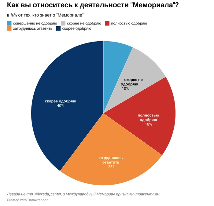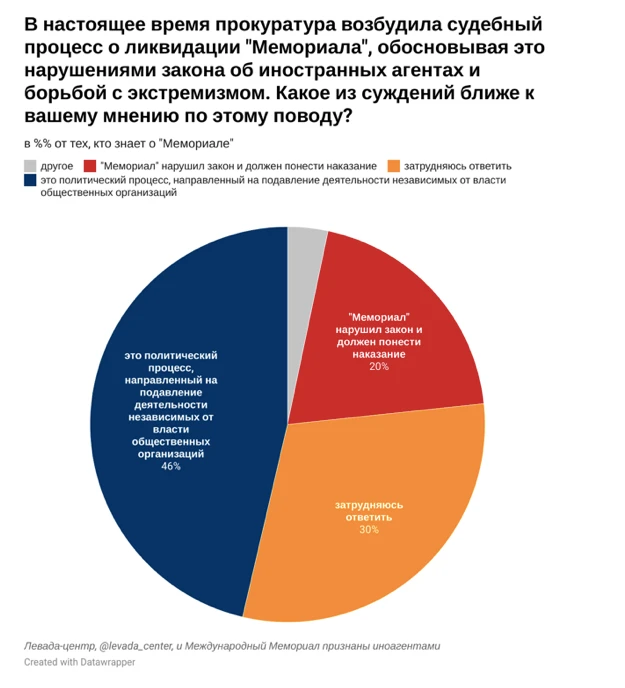 Также 46% из тех, кому известно о деятельности «Мемориала», считают процесс против него политическим, направленным на подавление деятельности независимых от власти общественных организаций. 20% придерживаются противоположной точки зрения — что «Мемориал» действительно нарушил закон и должен понести наказание. Помимо этого, как отметили социологи, 15% респондентов заявили, что среди их родственников есть пострадавшие от сталинских репрессий.