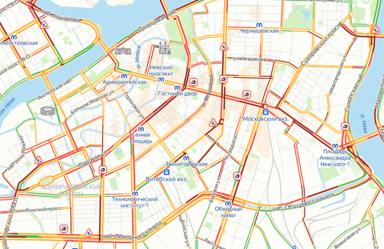 Согласно онлайн-карте, в центре города наиболее сложная ситуация на дорогах — в районе пересечения Невского проспекта и Садовой улицы, а также в районе площади Александра Невского. Протяженные пробки также собрались на набережной Обводного канала, Дворцовой, Воскресенской и Свердловской набережных.