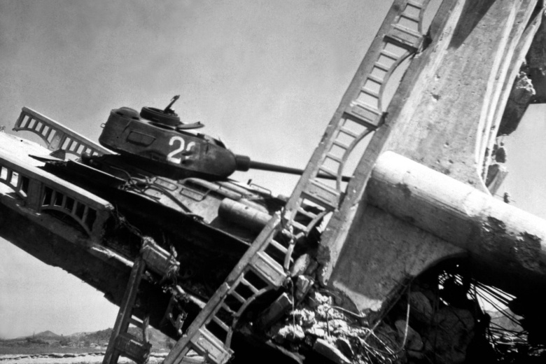 Северокорейский Т-34-85 на мосту, уничтоженном авиацией США, 1950 год. Фото: wikipedia.org