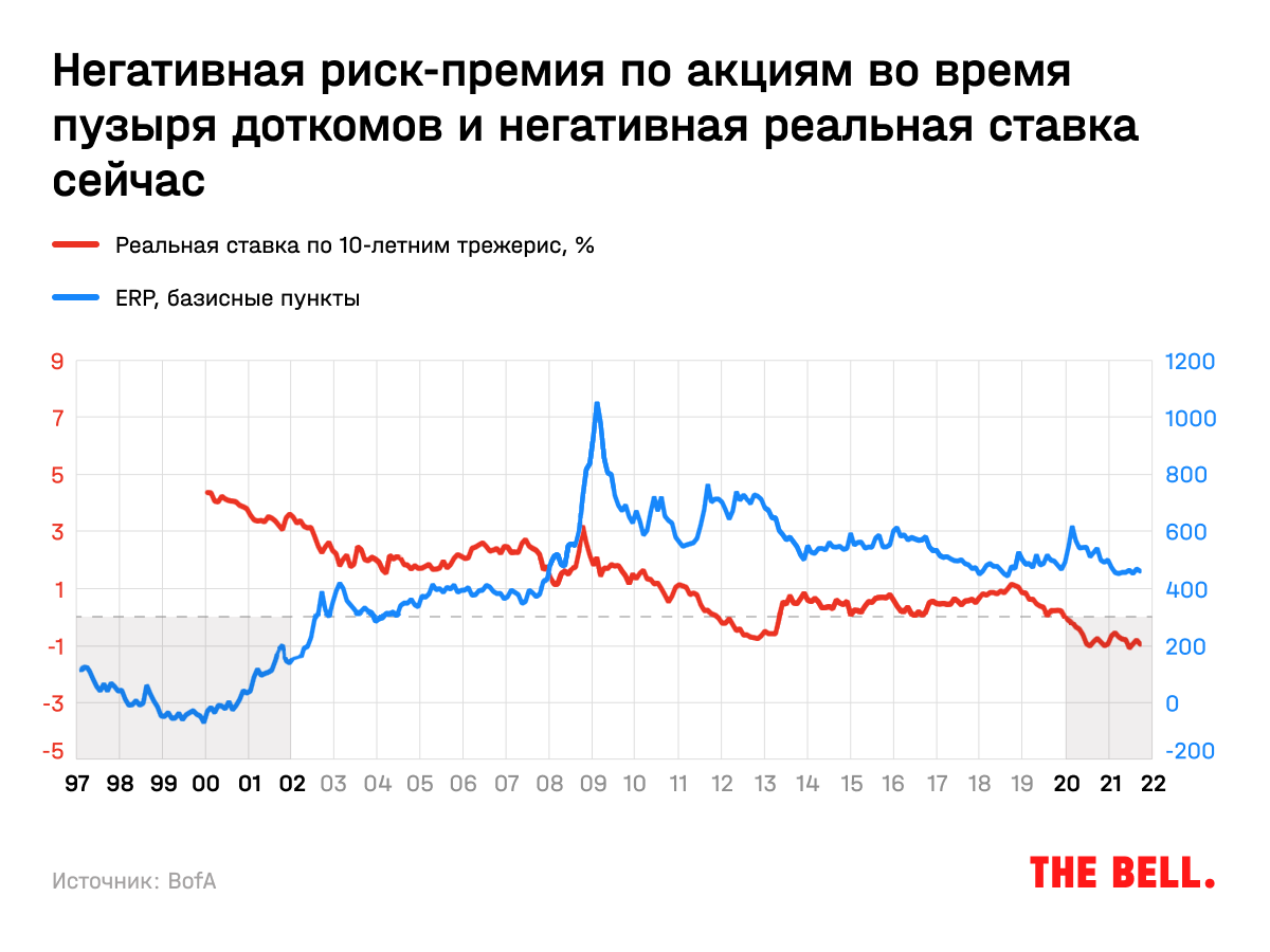 • Как и тогда, на рубеже 2021–2022 годов рынки принимают то, что в обычной ситуации сложно представить. Только перед пузырем доткомов это была отрицательная риск-премия (Equity Risk Premium, или ERP, — это премия, которую инвесторы требуют за вложения в рисковые активы (акции) по сравнению с безрисковыми), а сейчас это негативные реальные ставки. Это позволяет говорить о том, что сейчас пузырь находится не в акциях, а в облигациях, считают аналитики.