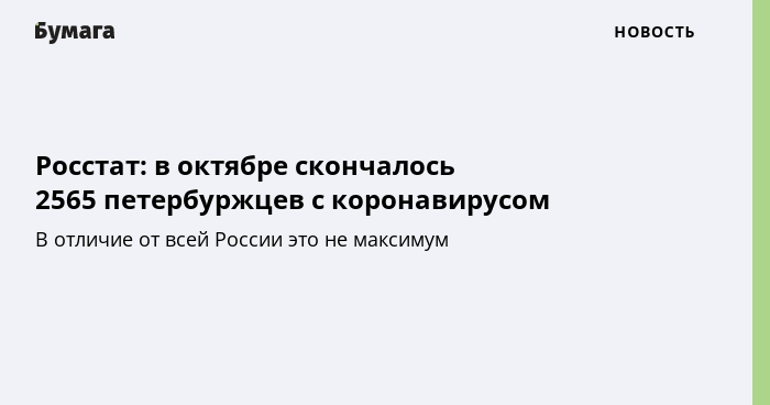 В октябре в Петербурге умерло 2565 человек с установленной коронавирусной инфекцией. Это следует из данных Росстата, предоставленных вечером 3 декабря.
