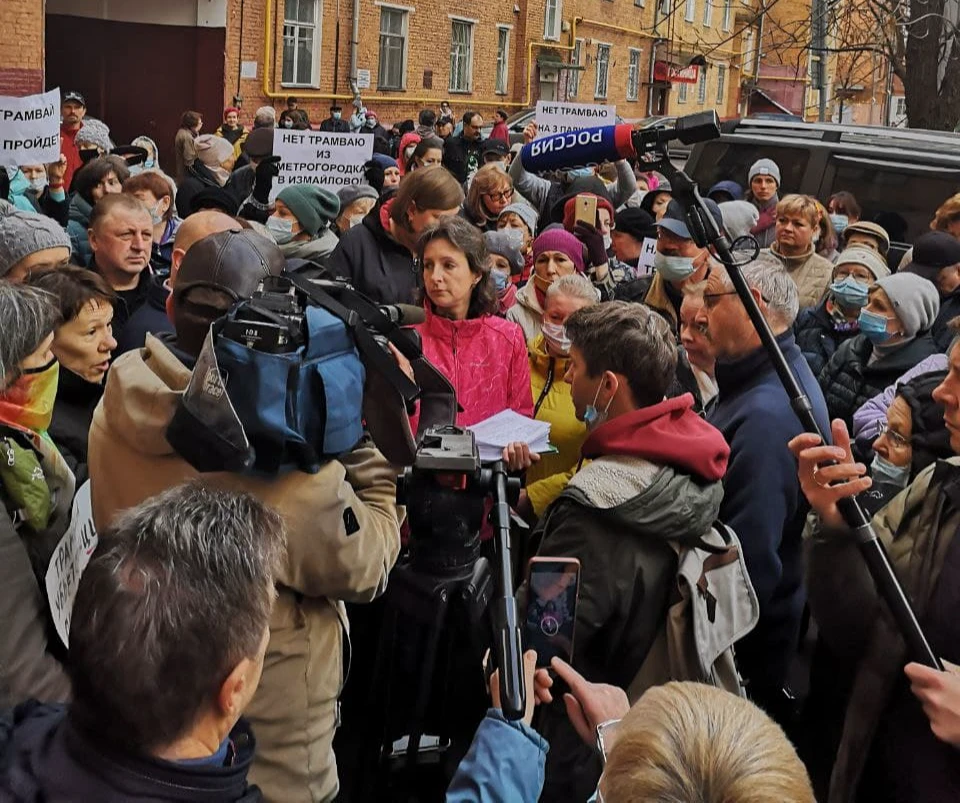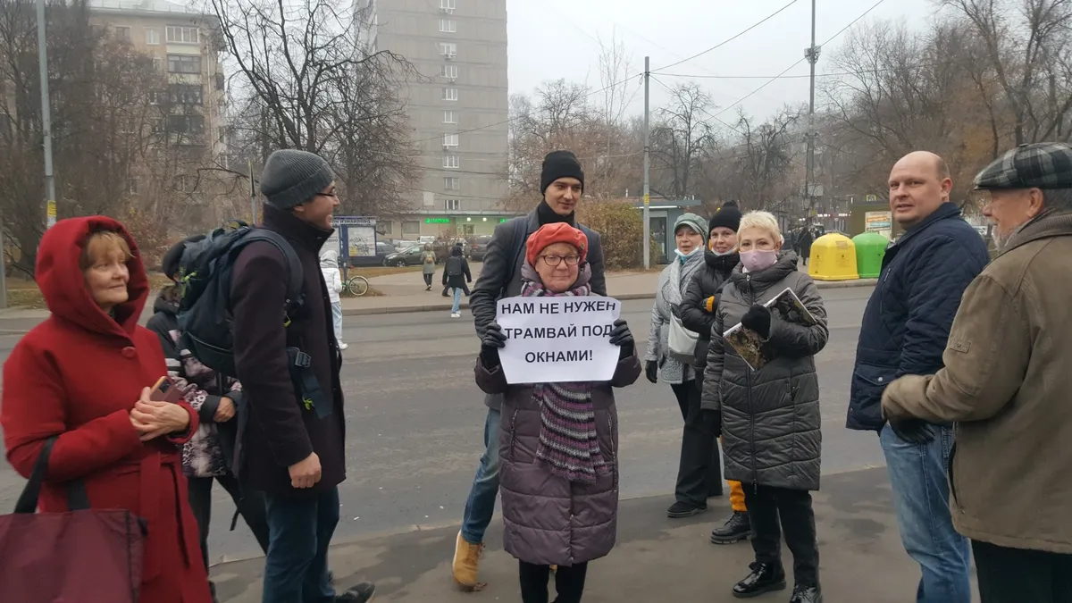 «Мы — жители районов Измайлово, Северное Измайлово, Восточное Измайлово, Гольяново и Метрогородок требуем отказаться от планов строительства под нашими окнами трамвайной линии», — заявляет на камеру одетый в длинную черную куртку мужчина. Позади него полукругом стоят два десятка человек.