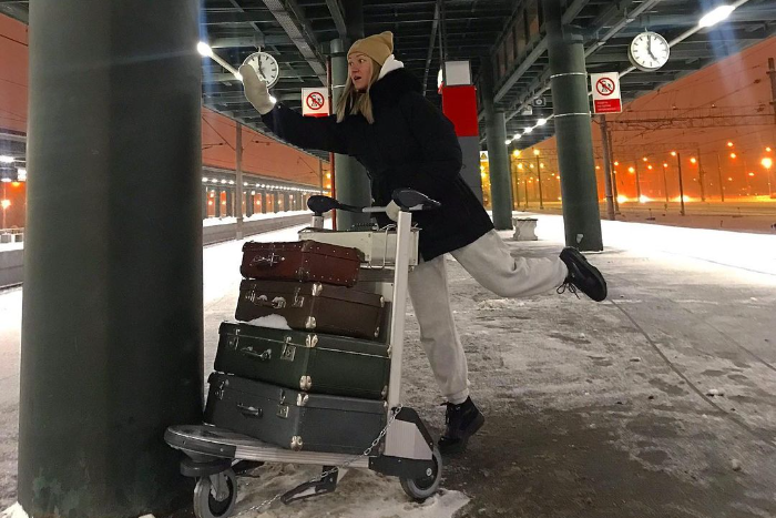 На вывеске с названием платформы сидит сова, а под ней разместили арт-объект в виде тележки с чемоданами, с которым можно сфотографироваться.