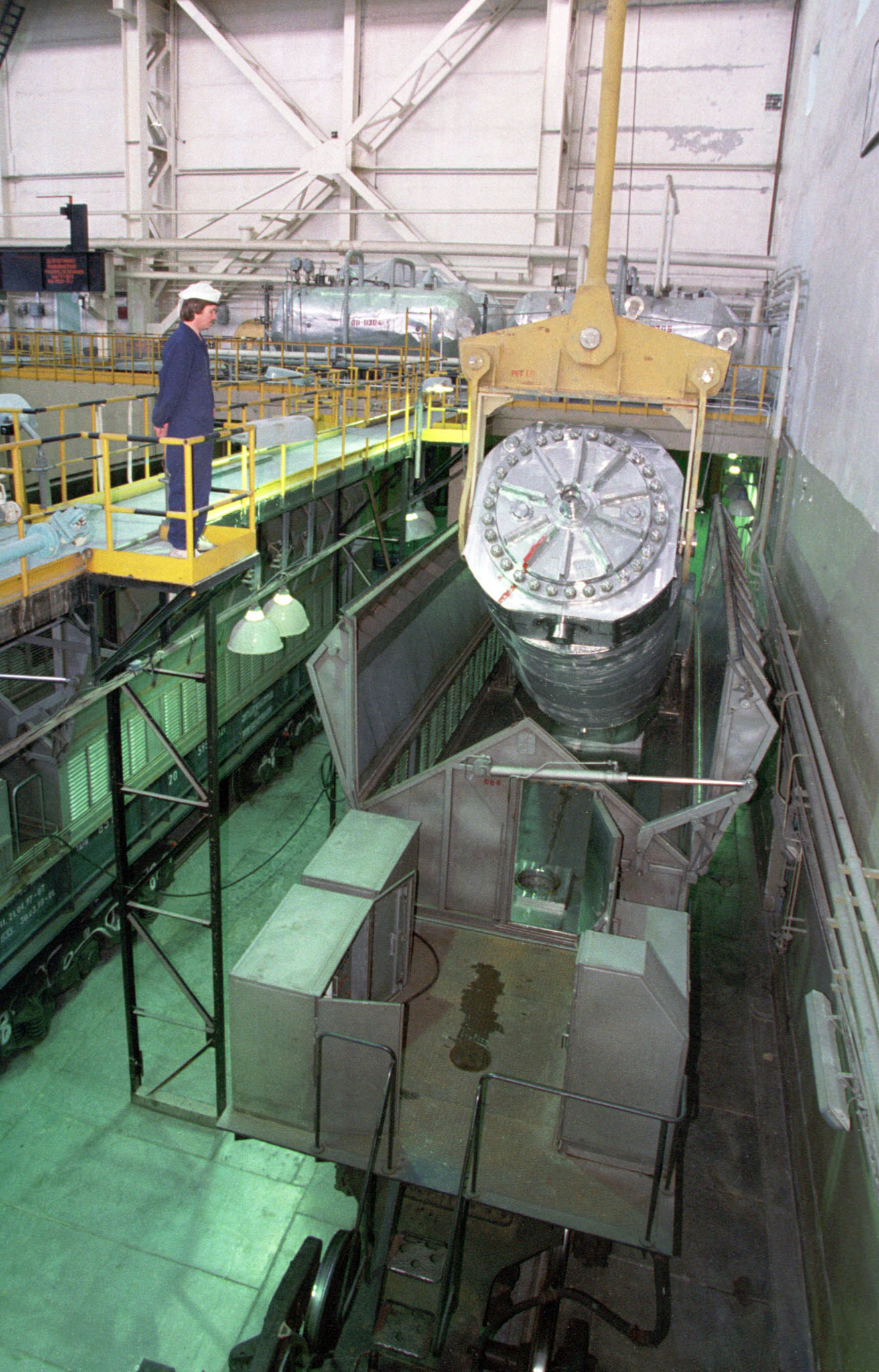 Общая схема обращения с таким отработанным топливом, производимым на российских АЭС, сейчас выглядит так: сперва трубки с ураном достают из активной зоны реактора и помещают на срок от 3 до 12 лет в специальные бассейны, расположенные при самих станциях. По мере того, как топливная сборка становится менее активна, ее готовят к транспортировке, грузят в специальный контейнер на железнодорожной платформе и доставляют до места захоронения. Как правило, на ПО "Маяк" на Урале или на Железногорский горно-химический комбинат (ГХК). Тут трубки еще раз охлаждают водой, снова помещают в специальные бассейны, а через пять лет перевозят уже во временное сухое хранилище.