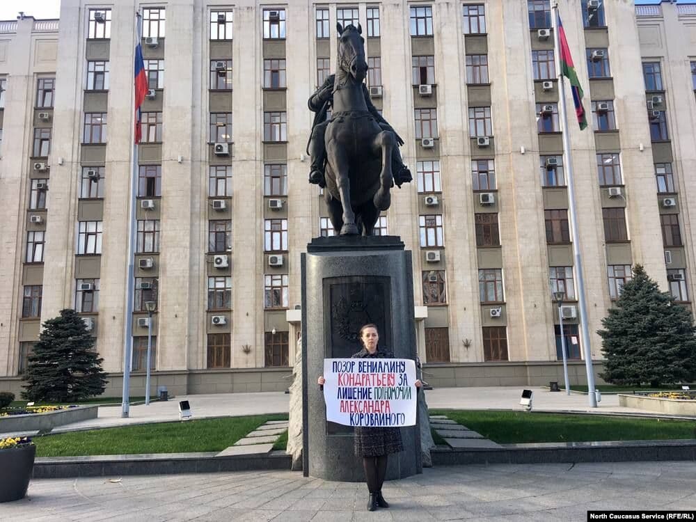 Экс-координатор регионального отделения ликвидированной "Открытой России" Яна Антонова провела перед администрацией Краснодарского края одиночный пикет в поддержку независимого депутата Совета Ейского района Александра Коровайного. После письма губернатора Вениамина Кондратьева и по формальным основаниям его могут лишить мандата.