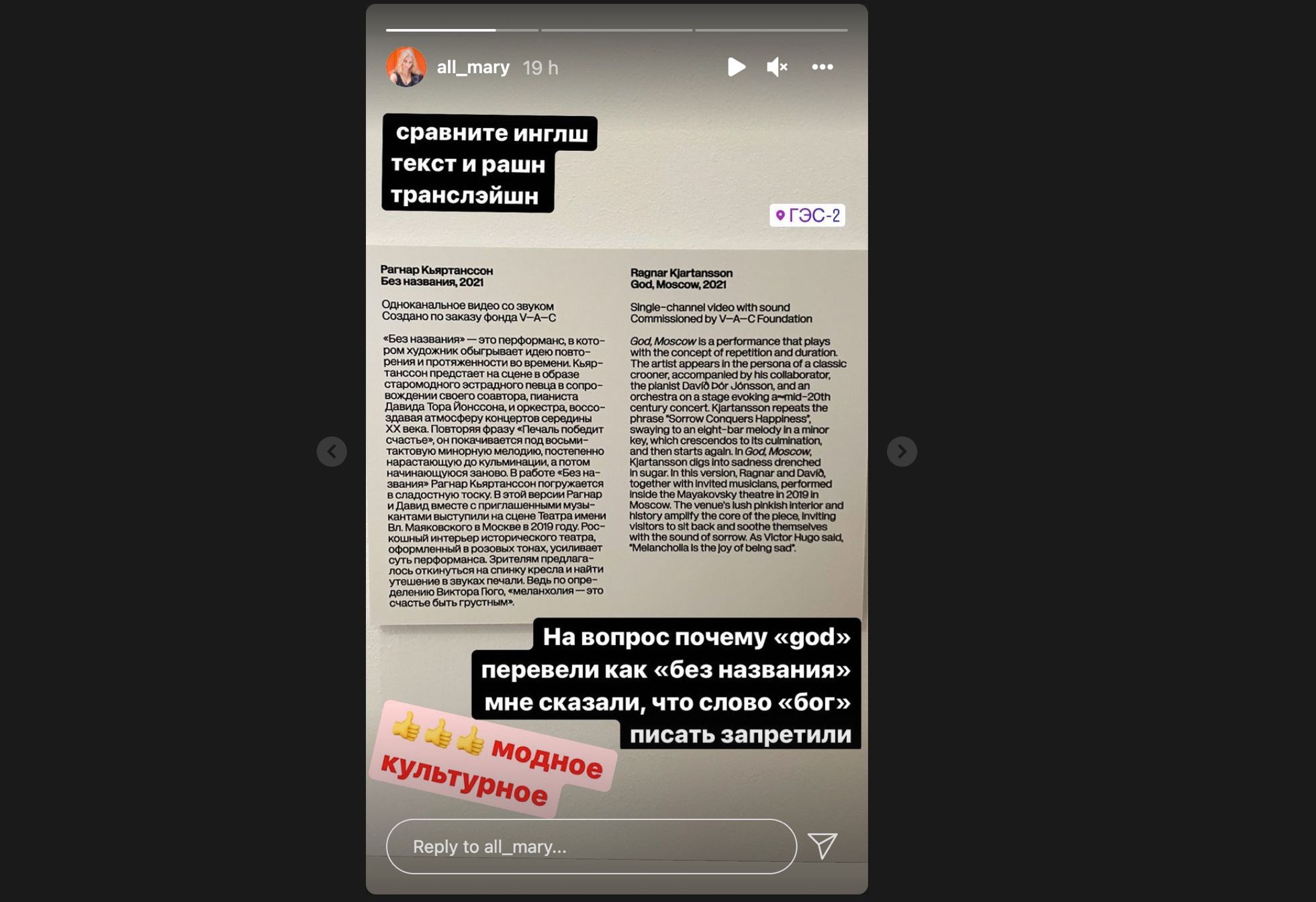 На экспозиции в московском Доме культуры «ГЭС-2» перформанс исландского художника Рагнара Кьяртанссона под названием «God, Moscow» перевели в поясняющей табличке на русский язык как «Без названия». На это, как пишет «Медиазона», обратила внимание участница Pussy Riot Мария Алехина.