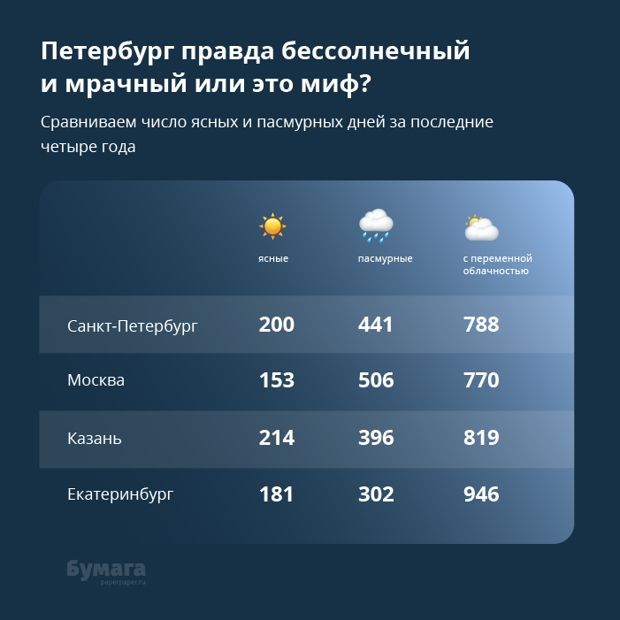 Из подсчетов следует, что за четыре года в Петербурге было больше ясных дней, чем в Москве и Екатеринбурге. Но меньше, чем в Казани.
