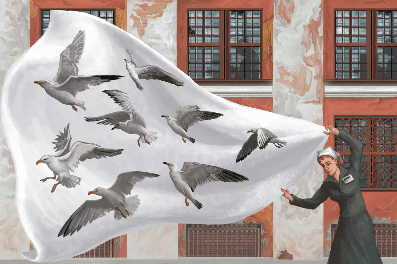 Заключённая отвечает кивком. Дежурная быстро вскрывает коробку, достаёт письма, еду, одежду, сканирует их специальным прибором и протягивает через стекло. Женщина убирает вещи в пакет. Она встряхивает красный свёрток — и тот превращается в длинное платье с перьями.